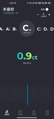 • Provides tuning for 12 notes between C4-B4 on a piano. During tuning, the indicator bar clearly shows the distance between the current note and the target note, and the frequency difference is displayed.
